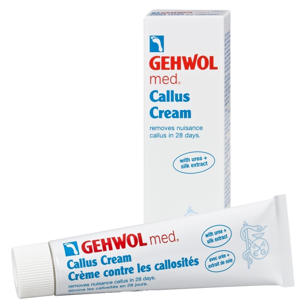 Urea in high concentration strengthened with glycerin and Allantoin loosens the cell bond of the hard callus layers. The cream removes annoying calluses within 28 days, it immediately softens and noticeably reduces callus within a few days. Lipids strengthen and protect; silk extract provides moisture and smoothes the skin. Do not use the cream on cracked or inflamed skin - in this case GEHWOL med Salve for Cracked Skin is recommended.