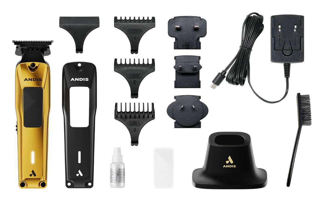 Trimmeris ir aprīkots ar zelta vāciņu un melnu teksturētu rokturi, sekundāro melno vāciņu un baltu teksturētu rokturi, 3 stiprinājuma ķemmēm (1,5 mm, 3 mm, 6 mm), asmens tīrīšanas birsti, augstākās kvalitātes uzlādes statīvu, USB-C uzlādes adapteri, asmens eļļu un asmens aizsargu.