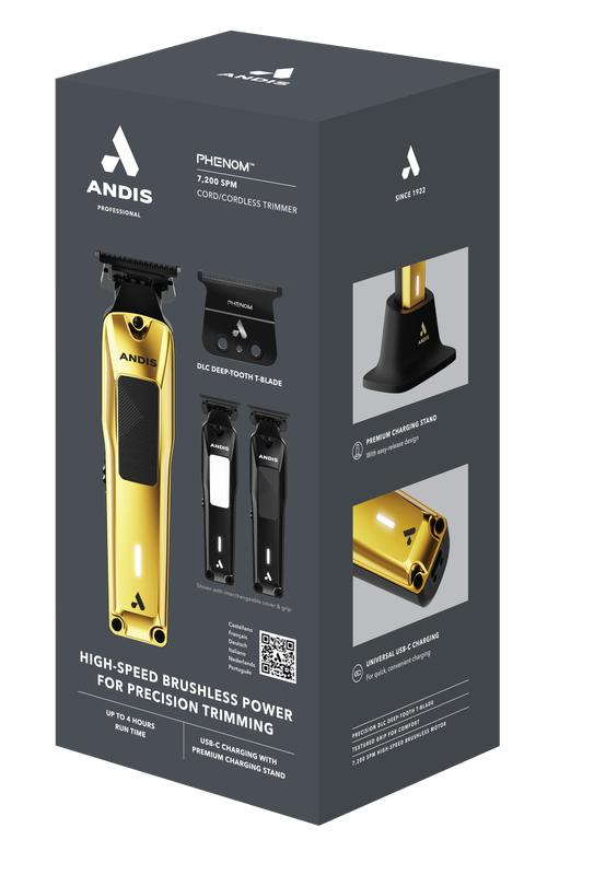 Phenom Trimmeris atbilst savam vārdam ar katru jūsu veikto griezumu. Ar jaunu bezsuku motoru tas nodrošina liela ātruma jaudu precīzam darbam ar ātrumu 7200 SPM. Izsakiet patiesu personalizāciju ar īpašu maināmu pilnībā metāla pārklājumu un roktura krāsas četrām krāsu kombinācijām. Nodrošiniet fenomenālas apdares ar DLC dziļi zobaino T veida asmeni un izbaudiet izcilu griezuma garuma daudzpusību, ja tās ir savienotas pārī ar komplektā iekļautajām stiprinājuma ķemmēm. Uzlādējiet bez piepūles, izmantojot universālo USB-C uzlādes adapteri vai viegli noņemamu premium statīvu jebkurā laikā un vietā.