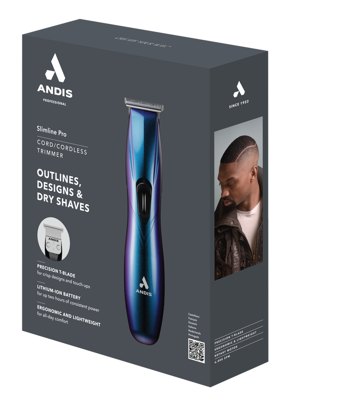 Andis Slimline® Pro Li vieglais matu trimmeris ar jaudīgu motoru, kas paredzēts lietošanai ar vadu vai bez vadiem, ideāli piemērots kakla izlīdzināšanai un konturēšanai. Litija jonu akumulators ar 120 minūšu lietošanas ilgumu bez uzlādes 150 minūtes, lai pilnībā uzlādētu akumulatoru manuāli regulējams asmens "0" darbībai iespēja strādāt ar kabeli darba ātrums 6000 apgr./min svars 0,14 kg Komplektā ietilpst: - lādēšanas stacija ar kabeli - adapteri: Eiropas, Austrālijas, Lielbritānijas - 4 plastmasas kontaktligzdas (1,55 / 3 / 6 / 10 mm) - Nazis (kat. Nr. 17 32225) - naža tīrīšanas birste - nažu eļļa