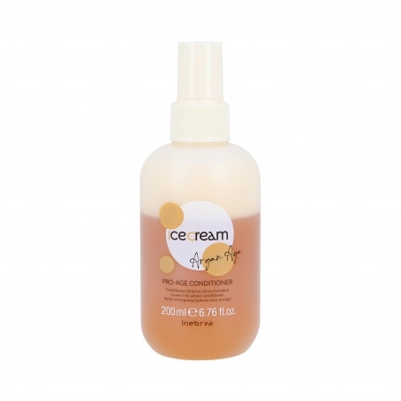 Divfāžu nenoskalojams kondicionieris spreja veidā ar vieglu formulu, kas paredzēta nobriedušiem un novājinātiem matiem. Inebrya Ice Cream Pro-Age kondicioniera formula, kuras pamatā ir argāna eļļa, saulespuķu eļļa un jojobas eļļa, efektīvi novērš strauju matu novecošanos, pasargājot tos no ārējo faktoru kaitīgās ietekmes. Produkts ir paredzēts arī novājinātiem, sensibilizētiem un ķīmiski bojātiem matiem. Satur īpašu UV filtru, kas aizsargā matus no saules starojuma, un antioksidanta īpašības lieliski aizsargā matus no brīvajiem radikāļiem.