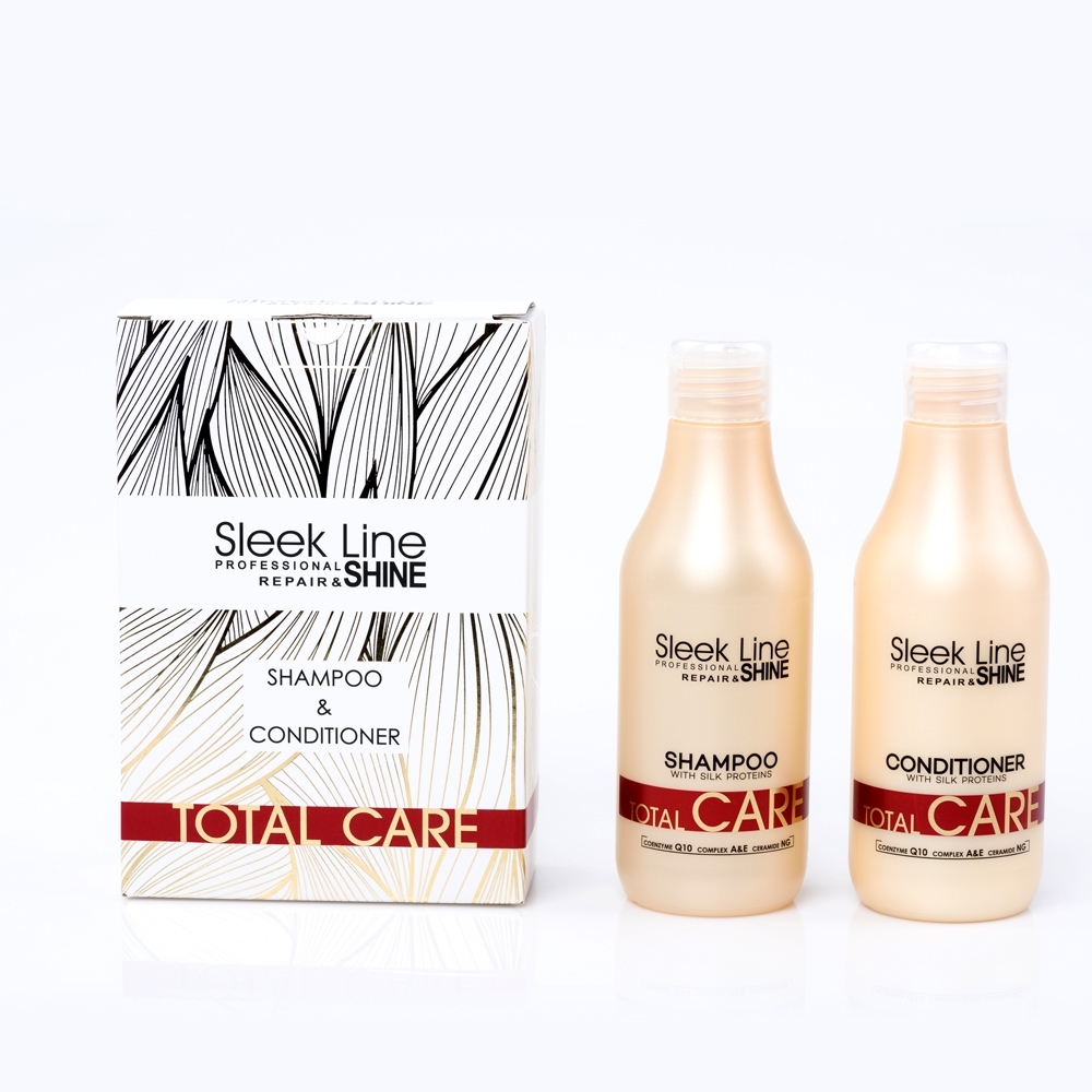 Total Care kondicionieris ar zīda proteīniem, vitamīniem A+E, keramīdiem un koenzīmu Q10. Kondicionieris paredzēts sausu, blāvu un jutīgu matu ikdienas kopšanai. Brīnišķīgi attīra galvas ādu, mitrina un nogludina matus, padara tos elastīgus un mīkstus. Piešķir mirdzumu, atvieglo ķemmēšanu un veidošanu. Lietošana: nelielu produkta daudzumu ieklāt mitros matos. Atstāt iedarboties 3 – 5 minūtes, pēc tam rūpīgi izskalot ar siltu ūdeni.